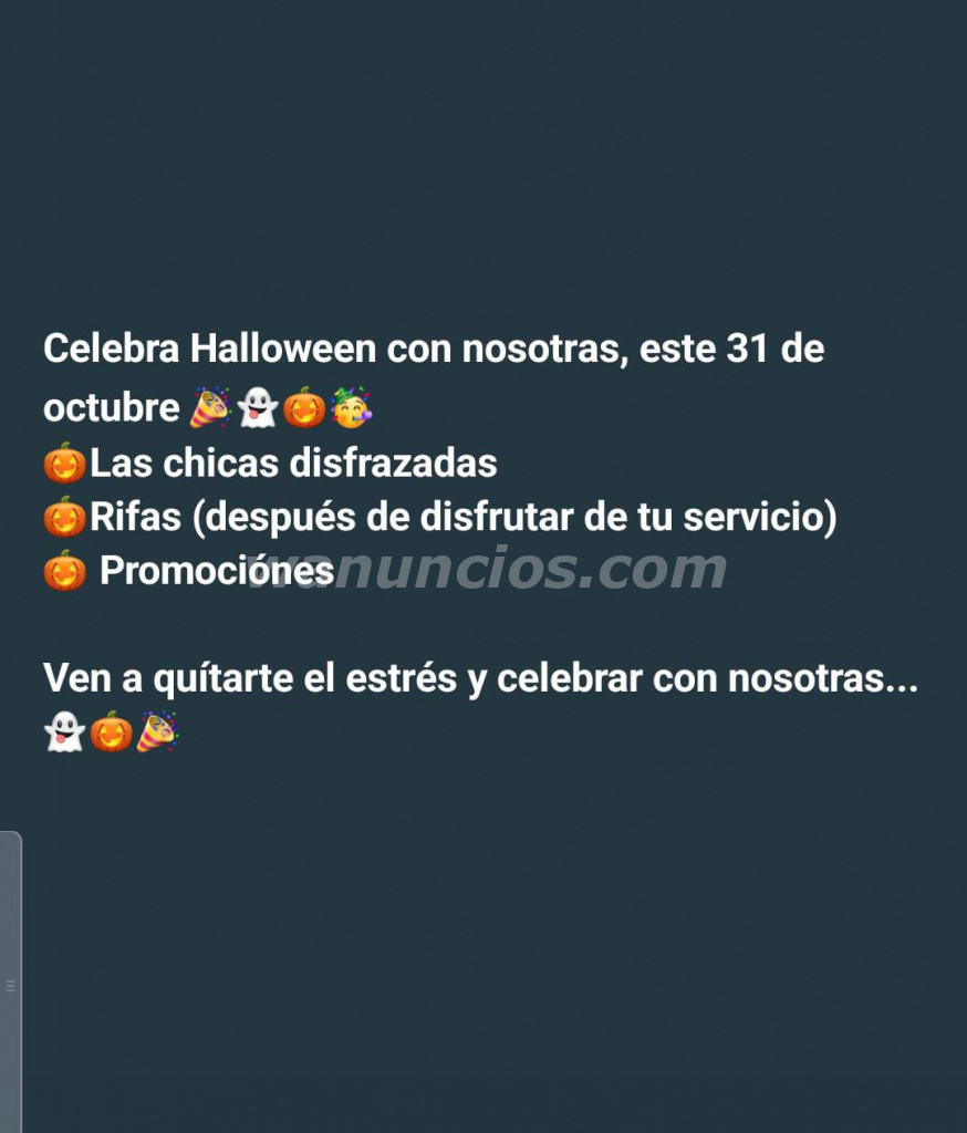 Disfruta Halloween con nosotras hoy, muchas promociónes, rifas y el staff disfrazadas, escribe para más información al 7852-5381 y se te pide por favor leer toda la información que se te envía gracias