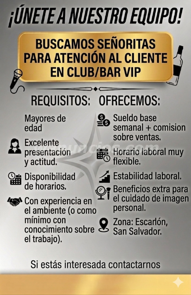 Estamos contratando señoritas para club/bar VIP (San Salvador)