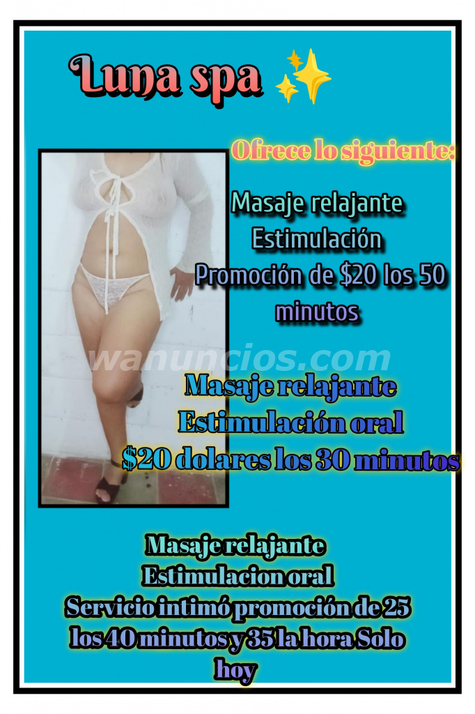 Ven y disfruta un masaje por nuestra señorita ven y relájate en luna spa masaje relajante y estimulación Promoción 20 los 50 minutos o si prefieres paga 25 y resive 45 minutos de servicio completo Masaje estimulación oral con preservativos y servicio intimó...disfruta ya as tu cita ya al 74617173