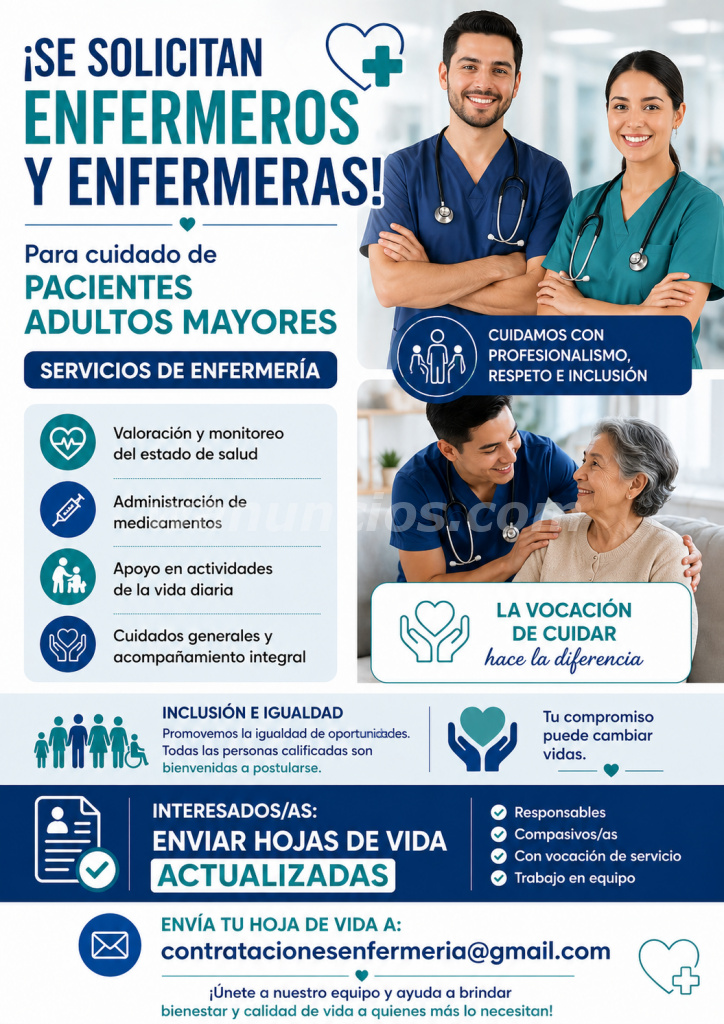 Eres enfermera/o y no tienes trabajo. o tienes trabajo y tienes dias libres y quieres generar ingresos extras, estas es tu oportunidad. Buscamos enfermeras y enfermeros con compromiso de trabajo, que sean responsables y tengan disponibilidad, Envia tuCV actualizado al Correo:contratacionesenfermeria@gmail.com